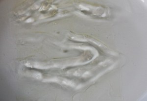 Mientras tanto poner la hoja de gelatina a remojo en agua fría para que se hidrate.