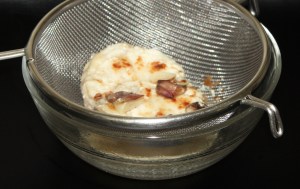 Colar. Reservar la cortada de rape y los ajos para hacer unas croquetas.