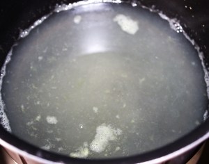 Poner el caldo. Rascar el fondo para desprender el rape que se haya quedado adherido.