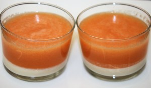 Como en el caso anterior poner la hoja de gelatina a remojar en agua fría y añadírsela al zumo caliente. Mezclar este zumo con el licuado de tomate, añadir una pizca de sal y unas gotas de tabasco, si os gusta el picante.