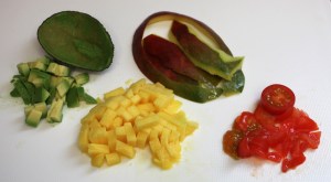 Cortar en daditos el aguacate, mango y tomates cherry.