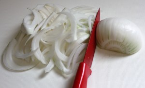 Colar, reservar la cebolla y volver a poner el aceite en la misma sartén.
