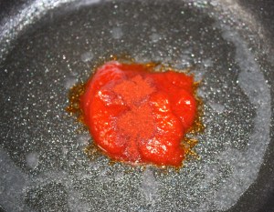 Añadir en esta sartén la cucharada de tomate y el pimentón. Vuelta y vuelta para que no se queme.