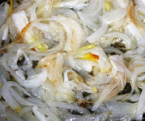 En una sartén con el aceite y la mantequilla, pocharla, fuego bajo hasta que esté transparente y comience a dorarse, unos 8 minutos. Mover de vez en cuando para que no se queme. Añadir un pellizco de sal.