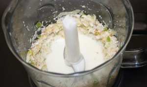 Añadir a la trituradora 4 cucharadas de leche para que sea más fácil obtener una pasta fina, y el perejil. Seguir triturando.