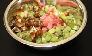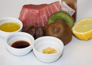 En un bol mezclar el atún, kiwi, dátiles y vinagreta. Dejar macerando en la nevera un hora.