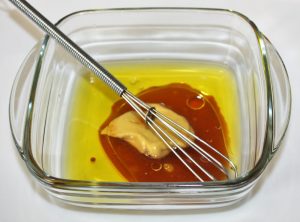 En un bol hacer una vinagreta con el aceite, mostaza, salsa de soja y gotas de tabasco. No se pone sal ya que la salsa de soja es bastante salada. Emulsionar bien con unas varillas.