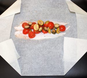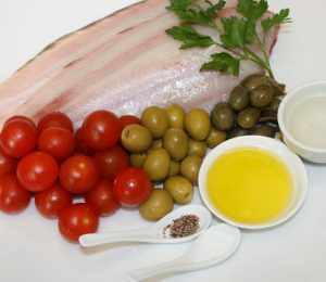 Hoy vamos a hacer lenguados con tomates cherry, aceitunas rellenas y alcaparrones.