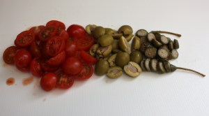 Cortar por la mitad los cherrys, aceitunas y los alcaparrones en rodajitas, eliminando el tallo.