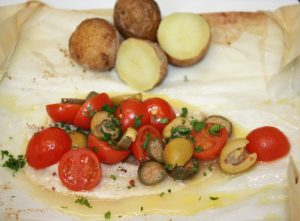 Servir el papillote sin abrir, acompañado de unas patatitas a la sal.