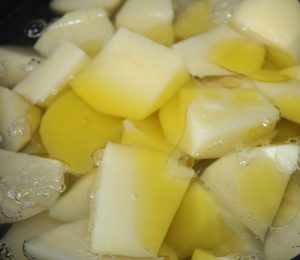 Pelar las patatas, cortar en trozos grandes y poner en un cazo con agua que les cubra. Añadir el aceite y la sal.