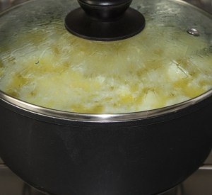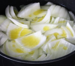 Pelar las cebollas, cortarlas en trozos y ponerlas a cocer en un cazo con agua, el aceite y la sal. 10 minutos a fuego medio.