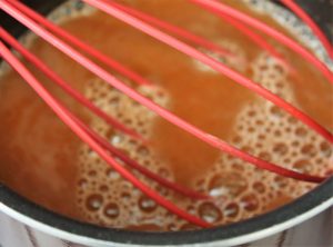 Colocar el licuado en un cazo, calentar ligeramente y añadir la gelatina escurrida con las manos. Mover bien con unas varillas para que se disuelva y no queden grumos.