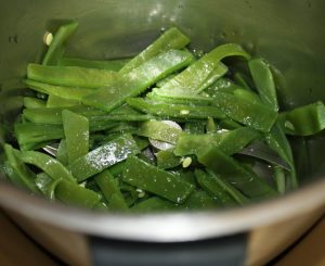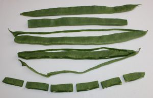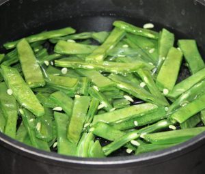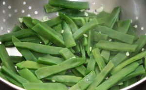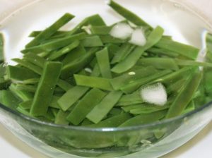 Cortar los extremos de la judías, los hilos laterales y partir en trozos.