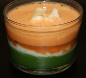 Encima la cebolla a temperatura ambiente, el puré de patatas caliente y para terminar un poco de espuma de zanahoria.