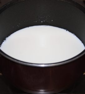 En un cazo poner a calentar la leche con la mitad del azúcar. Disolver.