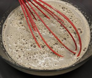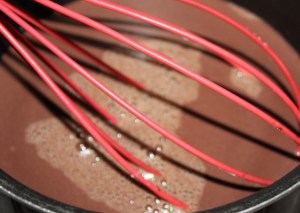 Añadir al cazo con la leche caliente. Mover bien con unas varillas hasta que se disuelva. Pasar a un bol y dejar entibiar.