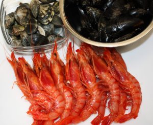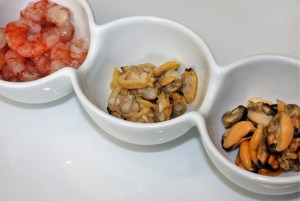 Añadir las colas de las gambas, los mejillones y los berberechos. Una vuelta y reservar. Las gambas se harán con el calor residual, de esta manera no se quedarán secas.