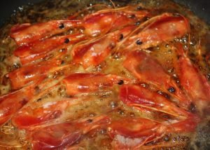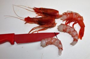 Pelar las gambas. Las cabezas las vamos a utilizar para el sofrito. Los cuerpos los reservamos, previamente quitando el intestino.