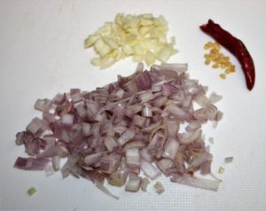 Picar las chalotas y los ajos. Cortar la gundilla por la mitad y eliminar las semillas para que no pique tanto.