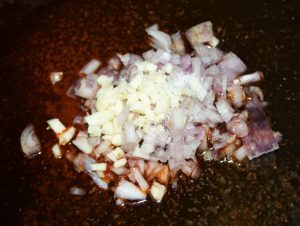 En la sartén con el aceite que hemos colado, sofreír las chalotas y los ajos. 5 minutos a fuego medio-bajo.
