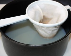 En un cazo calentar el caldo de pescado y el jugo que han soltado los moluscos pasado por una estameña para que no pase ningún resto de tierra. La estameña es un colador de tela que podéis comprar en cualquier bazar chino. Si no tenéis utilizar un colador de malla fina con un papel de cocina encima.