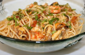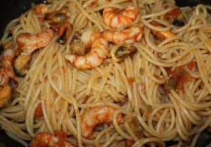 Cuando el caldo entre en ebullicón añadir los espaguetis. Cocerlos según las instrucciones del fabricante, unos 10 minutos. No añadir sal ya que el caldo ya lleva y el agua que sueltan los moluscos también es salada.