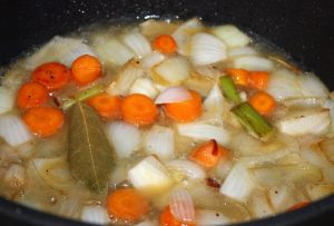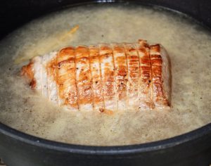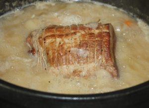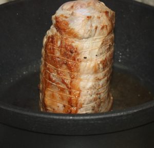 Añadir el gallón con los jugos que ha soltado en el plato y cubrir con agua, no del todo, solamente que cubra tres cuartas partes de la carne.