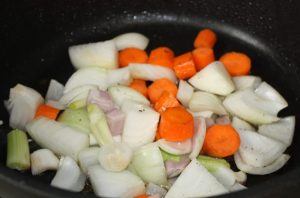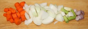 Pelar y trocear en mirepoix las zanahorias, la cebolla, los ajos tiernos y la chalota.