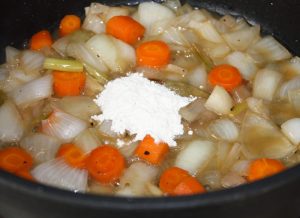 Momento de añadir la harina para que espese la salsa y el azúcar para contrarrestar la acidez del vino. Solamente una vuelta ya que la harina se quema con facilidad.