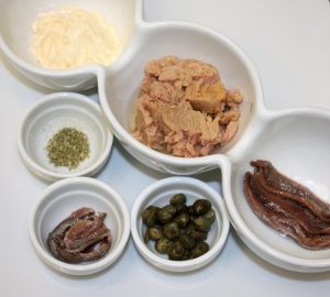 - Una latita de anchoas en aceite ( reservar 3 para decorar y el resto para la salsa )