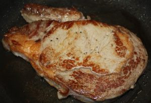 Para hacer un entrecot y que salga tierno, es muy importante que la carne este a temperatura ambiente. Hay muchas teorías sobre la sal. Lo cierto es que si se echa al principio absorbe los jugos de la carne y esta sale más seca. Como nosotros la vamos a hacer con queso, que suele ser bastante salado, solamente le vamos a poner una pizca cuando la pasemos por la sartén.
