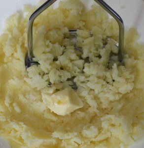 Con un machacador de patatas, machacarla, valga la redundancia, con la mantequilla y leche. Si no tenéis emplear un tenedor o pasar por el pasapurés. Probar de sal.