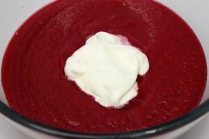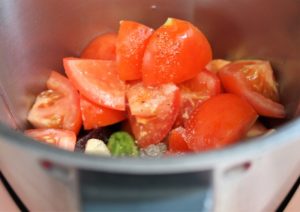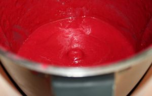 Triturar la remolacha con los tomates y pimiento troceados, el ajo pelado y partido en dos, el vinagre, aceite, sal y pimienta.