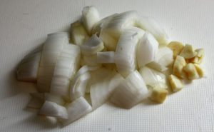 Picar la cebolla y el ajo en trozos grandes, no hace falta que quede muy picadito ya que después lo vamos a colar.
