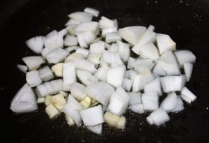 En una olla con 4 cucharadas de aceite, doramos la cebolla y el ajo picado, 3 minuto a fuego medio.