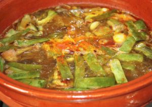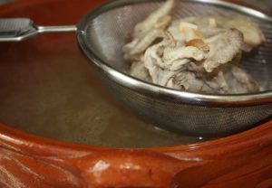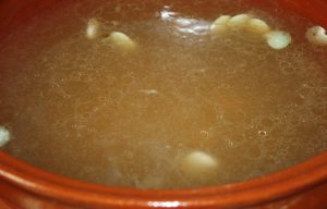 Colar este caldo en un olla honda de barro. Como os digo siempre si no tenéis emplear la que tengáis, pero para mí sale mucho más bueno en barro.