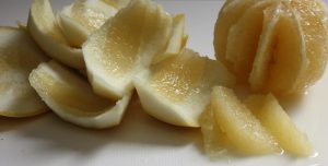 Pelar los pomelos. Cortar los gajos al vivo. Reservar el zumo que sueltan al cortarlos.