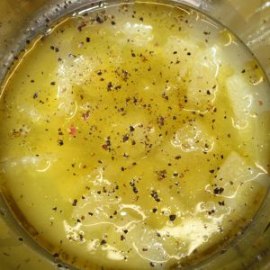 En un bol colocar este zumo, los gajos partidos por la mitad, una cucharadita de miel para quitar la excesiva acidez que aporta el pomelo, el aceite, la sal y pimienta.
