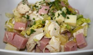 En el momento de comer mezclar la lechuga con los dados de pollo, jamón, queso y la vinagreta. Espolvorear con perejil picado.