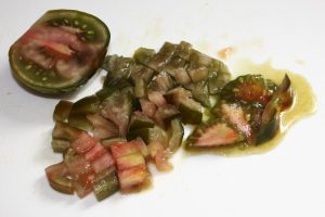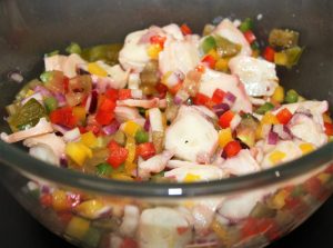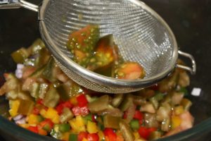 En un bol mezclar los dados de pimientos, cebolla, tomate, aceite, vinagre, sal y pimienta. Añadir el jugo que ha soltado el tomate al cortarlo y eliminar las semillas, colado.