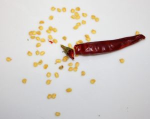Eliminar las semillas de la guindilla para que no pique tanto y cortarla en por la mitad.