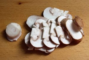 Cortar el tallo de los champiñones y filetearlos muy finos.