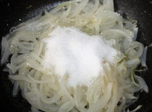 Añadir el azúcar y dejar cociendo a fuego bajo 5 minutos, destapado. Mover.