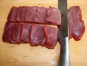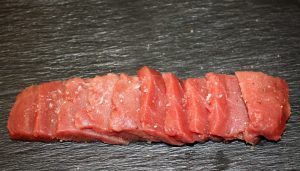 Cortar en rodajas de medio cm la ventresca, y cada una por la mitad para que sean de bocado.