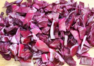Cortar la col en juliana fina, eliminando la parte blanca de la base….