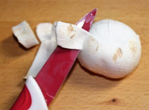 Quitar el pie de los champiñones y pelarlos con un cuchillo, de la base del sombrero hacia arriba.