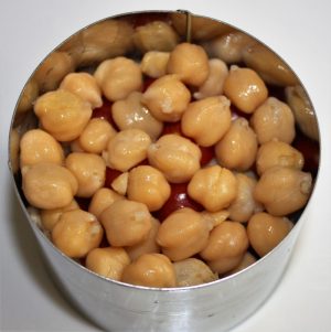 …. eliminar el aro con cuidado ( si se cae algún garbanzo o tomate no pasa nada, los volvéis a colocar ), y culminar con el calabacín, perejil picado, un chorrito de vinagre de Módena, aceite virgen extra y escamas de sal.