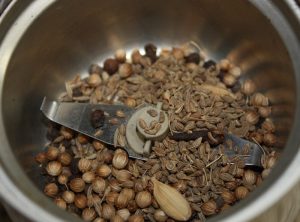 Añadir el resto de las especias ya molidas, pimentón, cúrcuma, canela, nuez moscada, sal y el jengibre rallado. Moler de nuevo para que todas se mezclen.