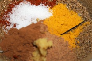 La carne se macera con Ras el Hanout, una mezcla de especias cuya composición puede variar bastante, no hay una receta fija, cada uno la elabora como más le gusta. Se puede encontrar ya preparada en tiendas de comida árabe, y por internet, pero nosotros lo vamos a hacer en casa.